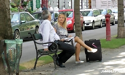 婀娜多姿的光头发乘务员被一个年长的女孩刺透了